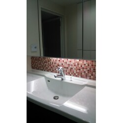 洗面入り口には、湿気対策のエコカラットをはり、ミラー部分 の上からかわいいカラーのタイルをご提案しました。 シックな洗面化粧台が、華やかになりました。