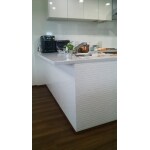 カウンターにLIXIL タイル貼りをご提案。 つや感のある白いタイルで明るく、高級感漂うキッチンに。