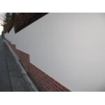 RCのシンプルなよう壁にご自宅と同じ素材のレンガを貼り、上部には、ベルアートSiを左官させて頂きました。