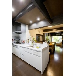 天井を少しでも高くするため天井梁を化粧し、LDK空間に広がりを持たせました。また、壁に向いていた流し台を奥様の夢だった対面キッチンにリフォーム。狭くて寒いタイル貼りのお風呂、脱衣場のない状態から、バリアフリーの洗面脱衣、ユニットバスにリフォームしました。