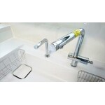 TOTOの新型システムキッチン ザ・クラッソには、既存の窓を残しつつ、明かりと風を通せる窓用アイキャッチウォールというウォールキャビネットがオプションであります。カウンターの高さも奥様の身長に合わせて高くしました。 新商品のザ・クラッソには、きれい除菌水というTOTOのクリーン技術が導入されます。 キッチンのシンクに吹きかけることで、除菌ができキッチンを常に清潔に保てます。