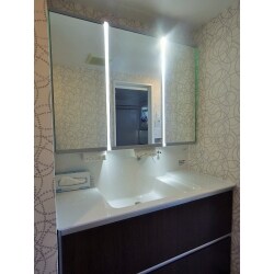 1面鏡で収納が少なく、カウンターの上に物を置いている。 3面鏡で収納付きを希望。 壁紙も凝りたい。