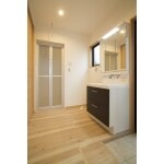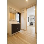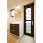 キッチン~洗面室の動線を良く考えました。 勝手口を洗面室に設置することにより、洗濯~干すの作業も楽になります。 少し広めの洗面室なので雨の日はここがランドリースペースとなります。