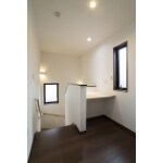 一番気を遣ったのが階段でした。 1階と2階とで床の色が違うのでどちらを優先するか・・・・。 迷った結果、 踏み面は2階のシックな色 蹴上げ面は1階の無垢材 としました。 2階から見るとシックないろに統一されているように見えますね。