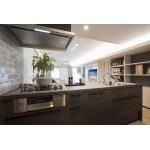 (旧積水化学工業株式会社での事例です。)奥様とご一緒にキッチン選びから通路の幅などにこだわり、キッチン裏にはパントリーを設置し、上質感のあるオープン型のキッチンをご提案しました。