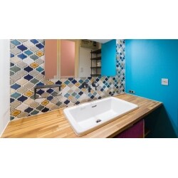 当初は給水・排水管交換も含め洗面室の全面改装という内容でしたので、既製品の洗面台もご検討されておりました。打合せの中で、「実は、既製品ではなくオリジナルな洗面空間を造りたい」とのご希望を伺いました。そこで正面の壁をタイル仕上げにし、大きめの鏡を取付、耐水カウンターを使用した奥行き感のある広々とシンプルなプランをご提案致しました。何度かお客様のご要望に合わせて、シンクや蛇口・照明スイッチ等の商品選定を繰り返し、掲載写真の仕様を決めさせて頂きました。当初のご予算もありましたが、「ご自分たちらしく暮らしたい」お客様のご要望にフィットするプランづくりをさせて頂いた結果ご採用頂きました。 また、デザイン性だけではなく、構造上洗面台の上部に梁が有り、洗面台に立った時の圧迫感の解消と、梁と鏡の間の天井にダウンライトを2灯設置する事で光が行き届く明るい空間をご提案致しました。 ご予算を抑える為に、設備品等の一部をご支給頂いたり、ニッチスペースの収納棚の棚板はご主人様に色を塗って作って頂くなど、施主様にも大変ご協力を頂きました。 お客様と一緒に完成させて頂きました。