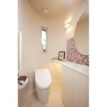 円柱状の空間にいるような遊び心たっぷりのトイレ。洗面台を備えた壁に可愛らしいモザイクタイルをあしらうなど、非日常的なデザイン性の高い空間を実現しました。