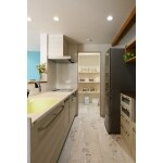 キッチンの並びにパントリーを設け、可動棚をズラリ。 奥様の趣味と実用を兼ねた作業スペースも隣接。 対面側にはカウンター下に掘り込み収納と機能性タイル (エコカラット)を使用しデザイン性も確保。