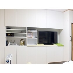キッチンとコーディネートしてホワイト色を選択。 天井高さいっぱいの壁面収納も、白のチカラで圧迫感を感じさせない仕上がりとなりました。