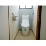 トイレは手洗いのしやすいリクシルさんの最新便器プレアスHSをおすすめしました。内装は当社のインテリアコーディネーターと打ち合わせをし、背面にアクセントを取り入れました。