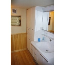 漏水箇所を調べて、根本的な修理を行いました。 修復後、湿気対策として、桐と珪藻土を床、壁に使用することをお奨めしました。 壁面収納棚も据え付け、すっきり、統一感のある洗面室になりました。 体重計が洗面台下に収納できるので、足元もすっきりします。