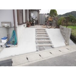 敷地と道路の高低差があります。普段の出入りを考慮しスロープと階段にいたしまた。階段がある事で自転車を手でおしても安全に出し入れができます。またスロープのコンクリート部分は、雨天時の安全も考慮しザラっとした仕上げとしております。