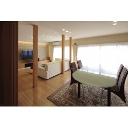 木造2階だての改装で、1階部分の2部屋の間仕切壁を取り除き、構造的な配慮を含め大空間のLDKにしました。 構造的に耐力壁を設置したり柱を残しましたが、意匠的な配慮をしました。他の部屋とも引戸を開けるとまるでワンルームのような間取りで、とても気に入っていただけました。キッチンの位置も変更して、快適に使っていただいております。