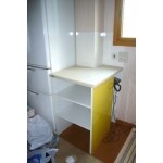 浴室の色とトータルコーディネートして 優しいパステルピンクの洗面化粧台にしました。 キッチン~洗面脱衣室~浴室の段差をなくしました。 隣の玄関側から使用している、 収納部分の一部を洗面脱衣室側から、 使えるように収納棚を作り、 洗剤やタオル等の細々したものを すっきり収納できるようにしました。