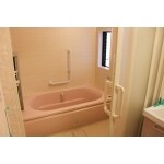 同じ方向からの写真です。 入浴中もゆったりできる 温かい優しい色合いの うすいピンクの浴室になりました。