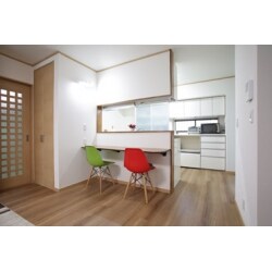 キッチンと和室をつなげ、広いLDKへ。収納を確保するため、吊戸棚の他、壁面には大容量のシステム収納を設置しました。