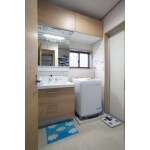 もともと、台所と同じ空間にあった洗面脱衣場を、間取り替えによって仕切られた空間としました。収納確保のために、裏面全収納付の3面鏡とアッパーキャビネットをご提案しました。