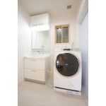 収納スペースと衣類乾燥機を完備した洗面所
