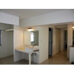 和室を洋室へ変更して3LDKから2LDKへ間取り変更し、その広くなったリビングの隅に大きな鏡と洗面台を配置、ベッドも置いて部屋を機能的に使えるようにしました。