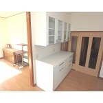 配膳と収納を兼ねて奥行のある背面収納を設置しました。吊り戸棚も届く位置に取付してます。