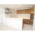 ホワイトのフローリングの中にアクセントでモダンな木目ブラウンをセレクトしていただきました。 腰壁とカウンターを少し高めにすることで、リビングから手元は見えないので安心です!