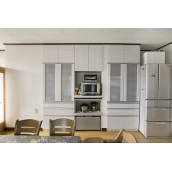 収納力抜群。 以前はデットスペースになってたL字部分に引き出せる棚が3つも付いて収納力抜群!何でも収納できるのでキッチンの上はいつでもスッキリ綺麗に保てるようになりました。