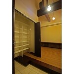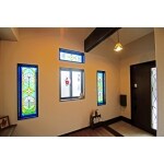 お客様の思い出の詰まったステンドグラスを特注サイズのサッシに組み込み、照明器具もステンドグラスを使っています。玄関正面には飾り棚を設置し、まるでギャラリーのような玄関ホールに仕上がりました。