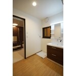 シンプルな洗面スペース。 収納力抜群、使い勝手の良い洗面化粧台を採用。 ご要望に合わせて収納棚も造作しています。