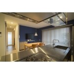 ダークブルーの壁は塗装仕上げです。 下地には塗装用のクロスを貼り、上から塗装をかけています。この色合いも素敵ですね。 吊り収納も換気扇もインテリアの一部となっています。