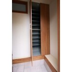 背の高い玄関収納の手前には、ベンチを造作。 靴の出し入れの他、ブーツ等を履くときにも利用できます。
