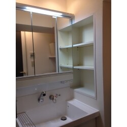 収納付きの三面鏡にしました。既存より鏡は小さくなりましたが、十分な大きさです。 既存の棚の扉は三面鏡と干渉するため取り外しました。 オープン棚になったことで空間が広くなったように感じられます。