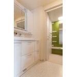 以前の洗面台は収納が少なかったため、洗剤類やタオルもたっぷりとしまえる洗面化粧台とキャビネットをおすすめしました。