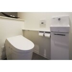 タンク付きトイレから、スッキリとしたタンクレストイレにリフォームをしました。 タンクがなくなった分、圧迫感が軽減され空間を広く感じることができます。 また、タンクレストイレは凹凸の少ない形状なので、拭き掃除もお手軽です♪ 内装はダークグレーをアクセントにしたシンプルモダンテイストに。 幾何学模様のクロスは光沢があり、デザインを施主様が特に気に入ってくださいました。 細やかなストライプのパターンが特徴的なクッションフロアと正面の壁には同じトーンのクロスを 施工して、統一感を出しています。 タンクレストイレでスッキリとしたレストルームは、アクセントになるダークグレーが更に空間を引き締め、 スタイリッシュな空間に仕上がりました。