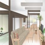 なるべく広いLDKを確保されたいとのことで、LDKに隣接する和室と一体化し、天井を一部吹き抜けにすることで、天井の高さでも広さと開放感を感じられる空間になるよう、ご提案させていただきました。