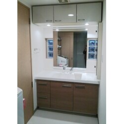 洗面ボールと水栓、下部キャビネットを交換取付けし、壁と床を貼り替えました。木目調で高級感のある洗面脱衣スペースに生まれ変わりました。