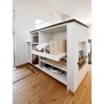 奥様のこだわりを詰め込んだ造作キッチンは、すっきりとしながらも動線を考慮した収納が使いやすい設計になっています。調味料・鍋など必要なものをすっきりと入れられるよう、深さ・大きさに配慮し棚を造作するなど、綿密な打合わせを重ねた結果、シンプルな見た目からは想像もできないほどの機能的な収納を備えています。少し高めの配膳カウンターは、固いイメージの調理機器がリビング側から視界に入ることで、全体のくつろぎの雰囲気を壊さないように工夫しました。カウンター側面には絵本、リビング側には雑貨や写真が飾れるニッチを造作し、ご家族で楽しめるスペースとなりました。