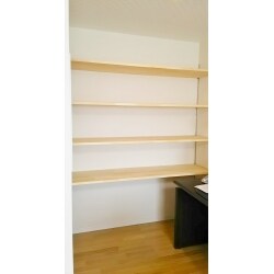 (旧京都建物株式会社(京都建物工務店リフォーム)での事例です。)PCスペースの壁に棚柱を取りつけ、棚板を乗せるだけの簡単収納スペースをご提案させていただきました。収納物の大きさによって棚板の高さを変えることが出来るので便利です。