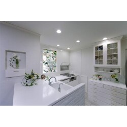 キッチンの広さは変えていませんが、LDとの間の下がり壁を取り除き、対面型キッチンにしたことでLDとのつながりを生み出しました。使われていなかった勝手口は窓に変更。新たな窓も設けてバラのステンドグラスを取り付けました。階段下のスペースは壁と一体感のある収納を造作し、電子レンジをキッチンとLDの両方から使いやすい位置に収納するなど、収納計画をきちんとたててつくり上げました。内装は白で統一し、明るくエレガントな雰囲気になりました。