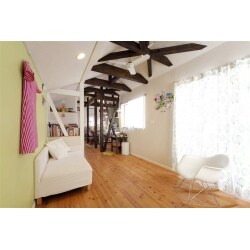 小さなお子さんと生まれてくる赤ちゃんの健康を考えて、リフォームに自然素材を採用することもFさんのご希望でした。床に無垢のパイン材のフローリングを採用し、植物性天然オイルを塗装。壁には珪藻土を塗り、断熱材にはセルロースファイバーを施工しました。2階に設けたLDKは天井を取り払って屋根の勾配を現し、天井の梁を見せて開放感を出しています。