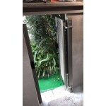 扉のサイズを少し小さくして外の様子が分かる程度に隙間を造り、簡単操作でロック機能が充実した勝手口の扉に入れ替えました。