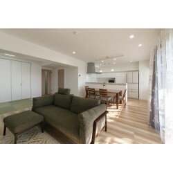 キッチンやリビングに繋がる和室の間仕切り壁をとり、キッチンは90度向きを変える事、和室はリビングに取込、部分的に畳敷きにする事等で、余裕の間取りのLDKを広々とした明るい大空間にするご提案をさせて頂きました。