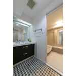 洗面本体、照明サイドパネルはそのまま流用しましたが、 モロッコタイル調のクッションフロアー、家族4人分が其々に掛ける事の出来るタオル掛けの有る、遊び心の有る、楽しい洗面になりました。