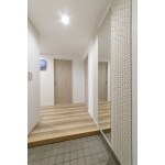リビングにも設けたエコカラットと鏡を組合せ、収納は白をにして明るく広々玄関にしました。