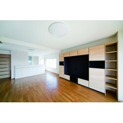 リビングには壁面収納が欲しいというご要望から、パナソニックのキュビオスを設置しました。 パソコンなどインターネット関連の物を置けるようプランし、スペースが空いた右側にはオープン棚を造作しました。