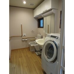 在宅介護をされているため、要介護者が移動しやすく、介助者が介護しやすくする、ということを第一に考えました。 浴室ドアを引き戸、洗面所入口も2枚引き戸にすることで、有効開口が大きくなり、車椅子でも充分に出入りできるようにしました。 また、ドラム式の洗濯機を使われていたので、浴室側に配置し設備前のスペースを確保するようにしました。 トイレ・洗面所の床の仕上げ材は、車椅子のタイヤで傷が付きにくい重歩行者用長尺シートを選択しました。 設備に関しては、トイレに座面が昇降して立ち上がりをサポートするトイレリフトを設置し、洗面台はボール面が上下して健常者と車椅子使用者が併用して使える座・ドレッサーにしました。ユニットバスは、浴槽にバスリフトとトランスファーボードを設置してボードで体を洗い、そのままスライドして浴槽に浸かれるようにしました。