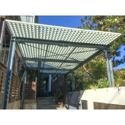 カーポートの屋根はテラスにもなっていたのでフラットでしたが、他社の見積もりでは勾配を付け雨樋を設ける内容でした。 しかしその施工を行ってしまうと見た目にも好くない事や樋が敷地から出てしまうので不採用になりました。 そこで提案したのが軽くて強度のあるFRPグレーチングにポリカーボネート板を被せる方法を考えました。 勾配は1/100で水平に近いので人があまり違和感を感じることなく乗ることも可能です。 樋はアルミ製のコの字を採用し、在来鉄骨フレームの上で処理した為、敷地からははみ出ずスッキリとした見た目になりました。