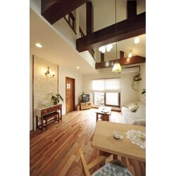 暗さ解消のため、日当たりを考慮してLDKを2階に移動。天井は吹き抜けにして、さらに開放感を演出しました。吹き抜けには広さ5帖のロフトを設けています。 ロフトは当初収納に使う予定でしたが、床を貼り手すりを設置することで単なる収納とするのがもったいない仕上がりに。子どもたちの格好の遊び場となっているそうです。 水目桜の床、珪藻土の壁に、アクセントとして一部にエコカラットを使用しています。梁は既存のものに木材を貼り、化粧することでナチュラルな雰囲気に合わせました。