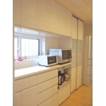天井を高くとり、垂れ壁、吊り戸棚も撤去、オープンキッチンにして開放感のある空間になりました。ダイニングの窓を上部に移動させ、窓の形状もスタイリッシュなものに変更。構造上取れない柱は飾り棚&マガジンラックに。キッチン背面には大きな収納を設置。食器や小物が全て納まり、いつでもスッキリした状態を保てます。キッチンの立ち上がりには、手元収納を設置し、ダイニングからの目隠しにもなります。キッチン前面にエコカラットを貼り、結露や脱臭効果とともに、ダイニングのアクセントにも。キッチン横にはモザイクタイルを貼り、雰囲気をオシャレに演出。また、広い一坪のユニットバスには浴室乾燥機とエアインシャワー、洗面所には壁面いっぱいの大きな洗面化粧台と広くて泡切れの良いボウル、といった機能的な設備を備え、快適な生活を送れる様にプランしました。