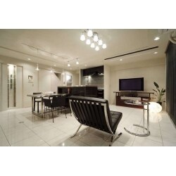LDKは約18帖の広さです。 置き床工法を採用して防音性に配慮した上で、床はタイルで仕上げています。冷たい印象にならないよう、壁・天井には珪藻土を、建具や収納キャビネットは無垢材を使用しています。 また、LDKの空間の間仕切りとして天井に設置したロールスクリーンはホームシアターにも使える、機能と生活の楽しみを兼ね備えたアイデアです。シャンデリアやダウンライトなど多彩な照明を採用し、シーンごとに異なる光の演出ができるように工夫し、スタイリッシュで落ち着きの感じられるインテリアにしました。