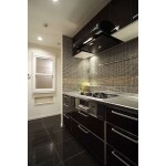 ご家族で料理を楽しめるよう、独立型のキッチンから、Ⅱ列型キッチンへ変更しました。黒のタイルやダークブラウンのキッチン扉など、黒系をベースにしたキッチンは、白がベースのLDKの中でより一層シャープな印象を醸し出します。 キッチン奥の窓は、浴室に設けた窓です。